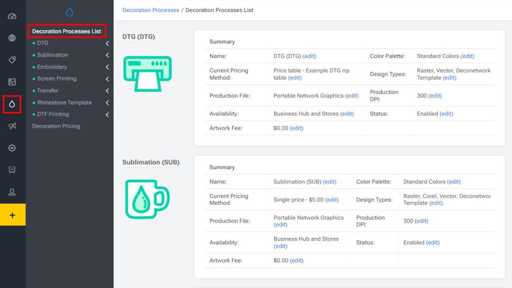 DecoNetwork provides comprehensive tools for managing various decoration processes in the apparel and promotional product decoration industry. These decoration processes encompass a range of techniques used to customize garments, accessories, and other items with designs, logos, or artwork. These are the decoration processes supported by DecoNetwork; DTG Printing, Sublimation, Embroidery, Screen Printing, Transfer, Rhinestone Template, DTF Printing, and UV Printing.
